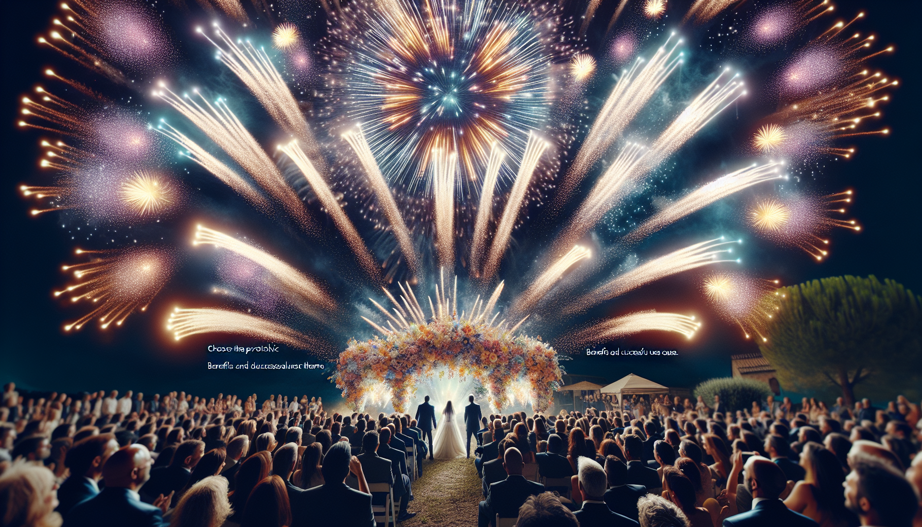 – Per un matrimonio, uno **spettacolo pirotecnico matrimonio** con effetti romantici e coreografati sulla musica scelta dagli sposi è perfetto.