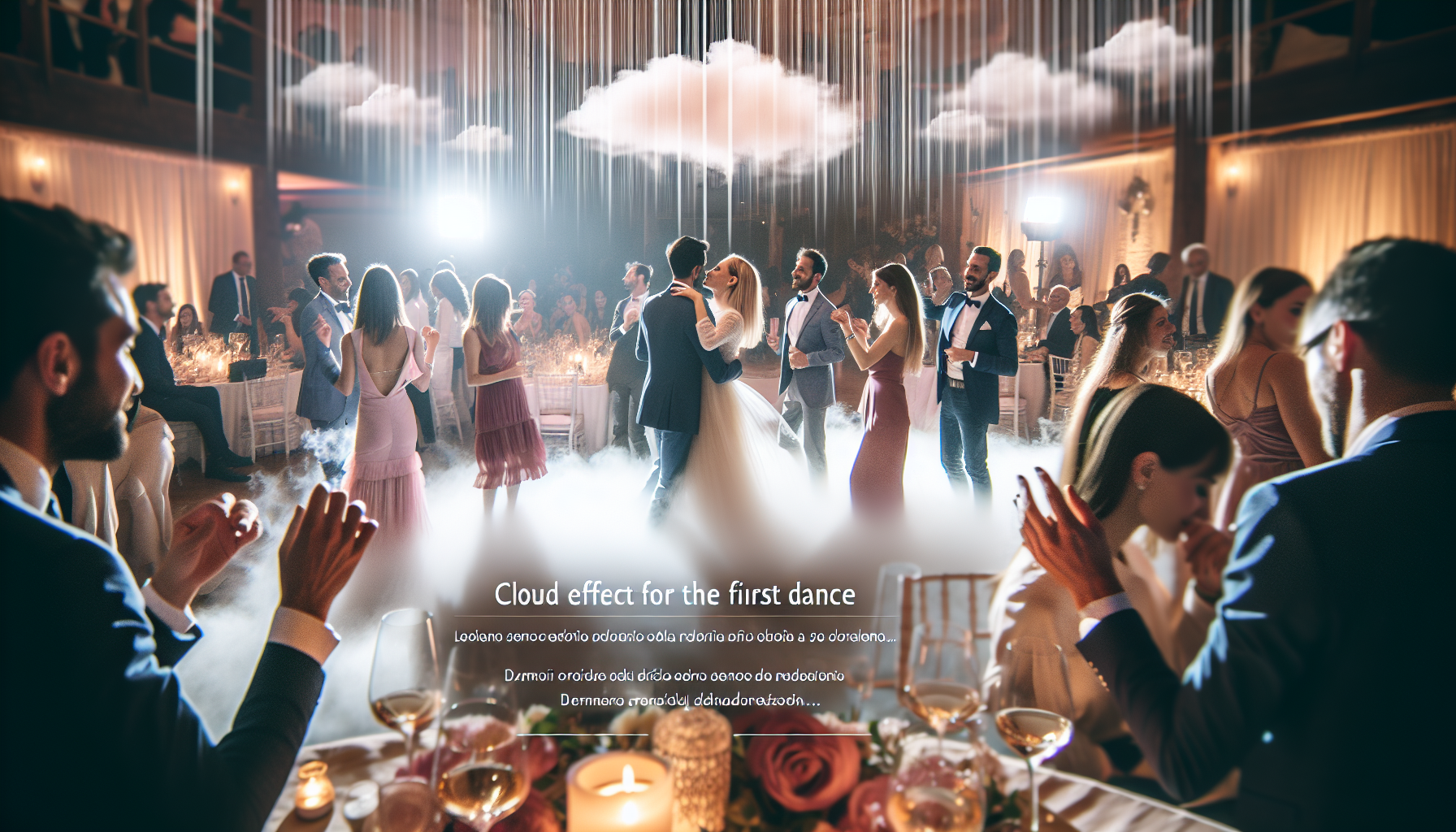 Il fumo romantico che avvolge gli sposi durante il primo ballo crea un’atmosfera intima e da sogno. Il pavimento si trasforma in una superficie soffice e vaporosa, perfetta per immortalare foto e video emozionanti. Questo effetto contribuisce a far sentire protagonisti gli sposi, regalando loro un ricordo indelebile.